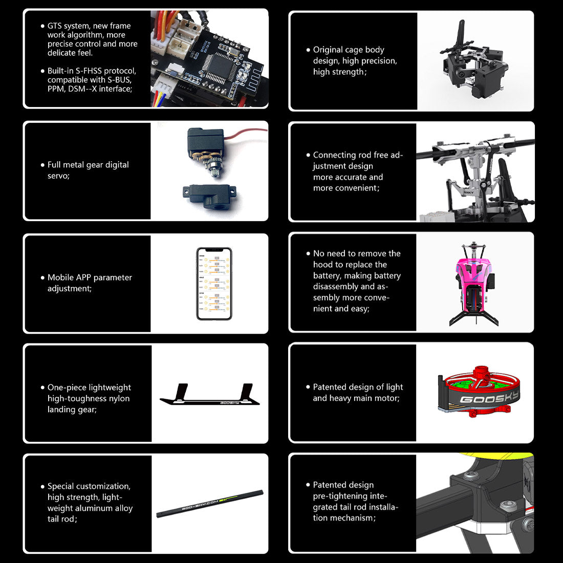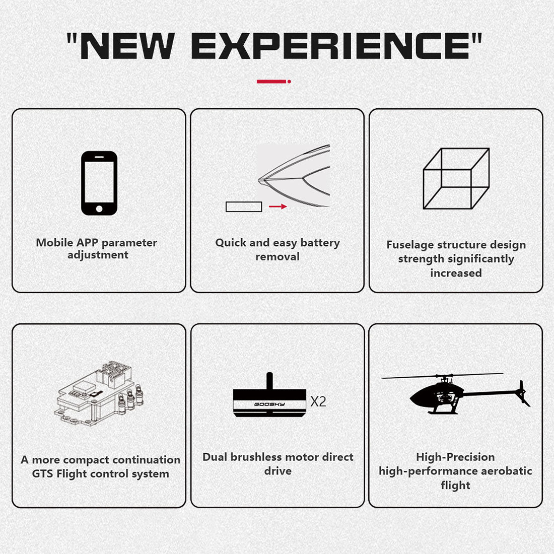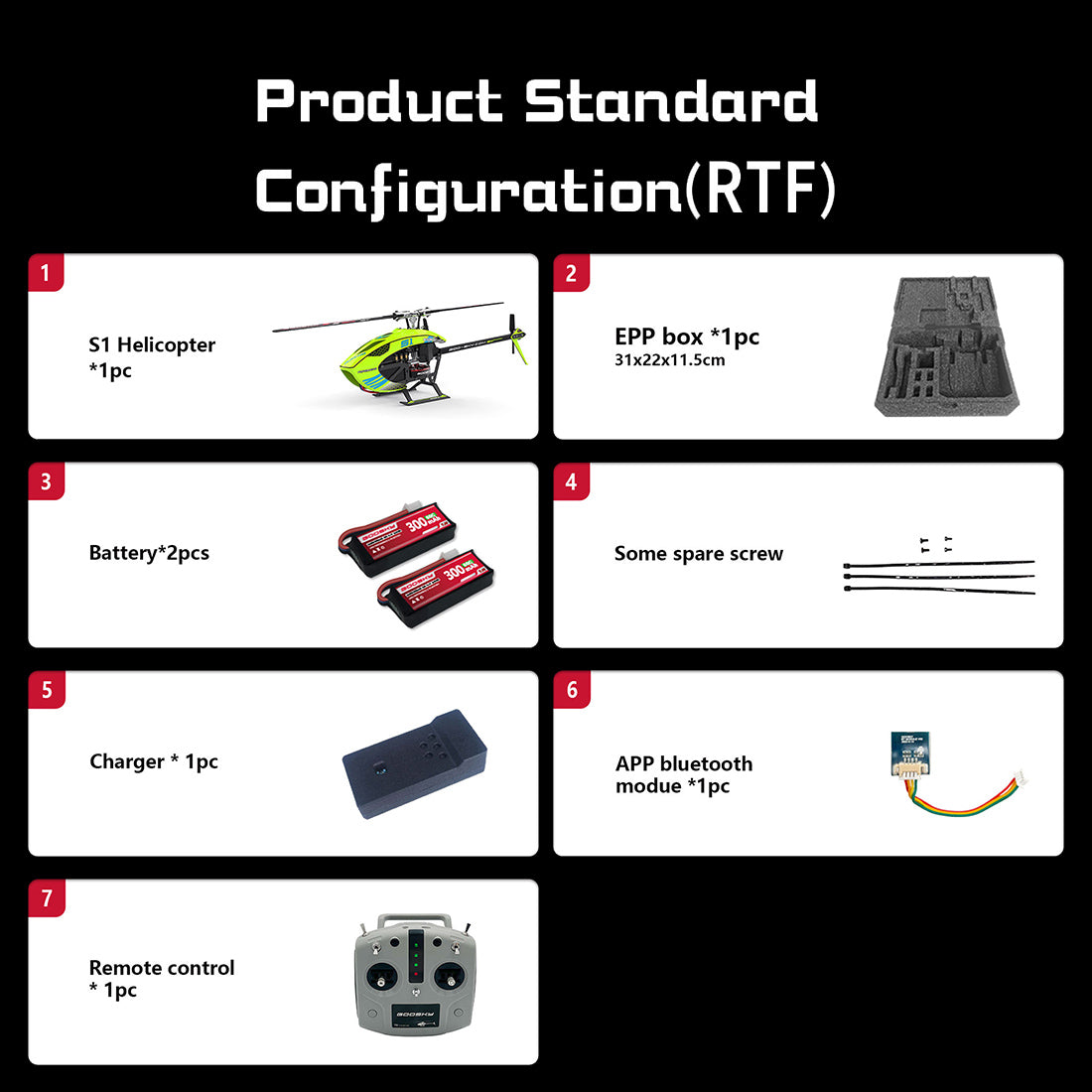 1. Innovation: S1 is a high-quality entry-level, boutique stunt helicopter. Compact and exquisite body, high-performance dual brushless motors at the front and rear, the latest aerodynamic spiral award; carbon fiber frame body structure, hood-free quick-install battery design, extremely light weight unmatched in the same class, making flying easier freely.