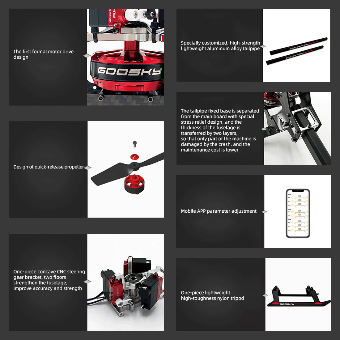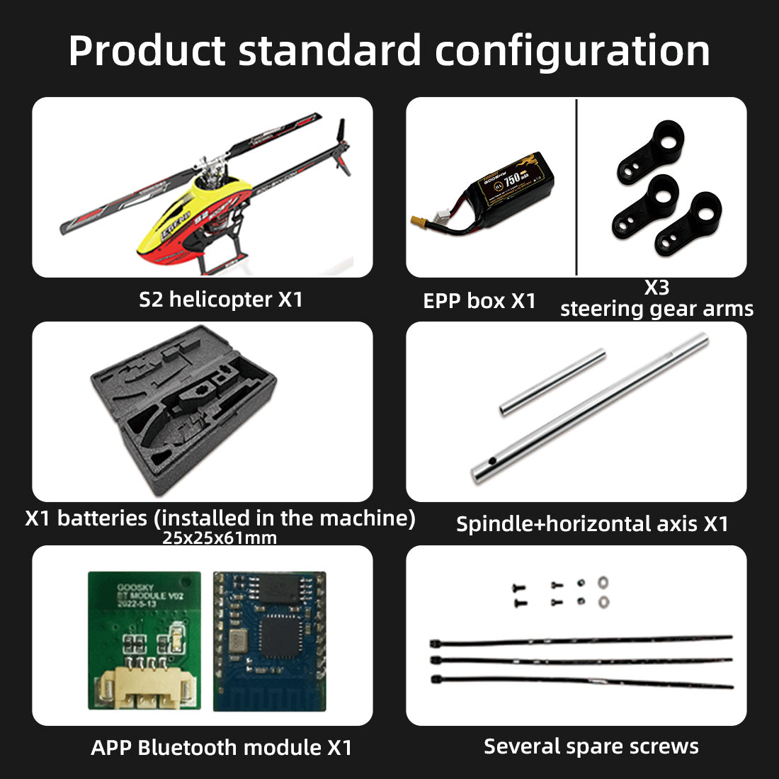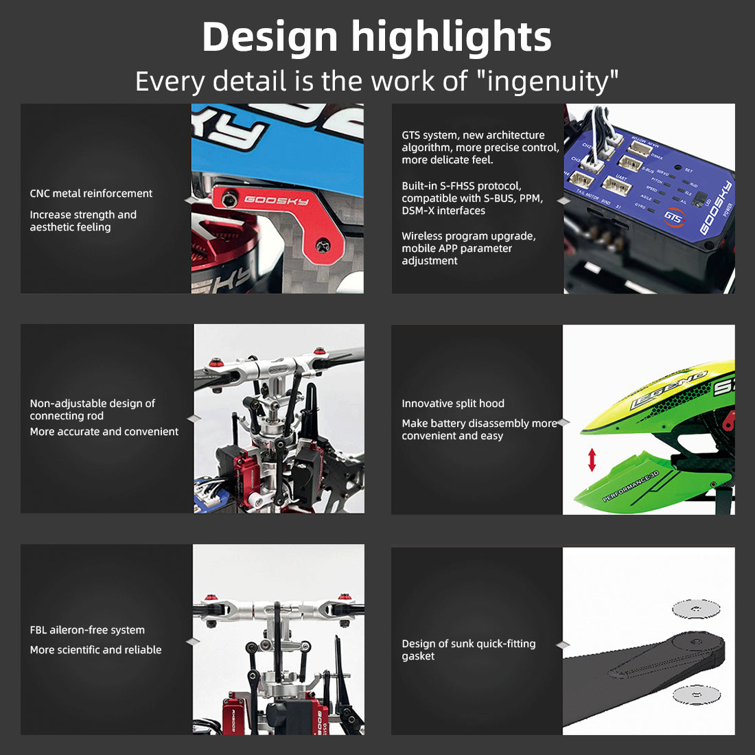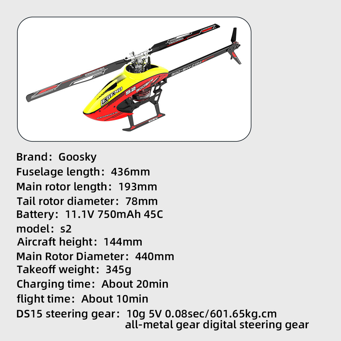 1. Realistic and classic: S2 is a high-performance product specially created by the GOOSKY R&D team for RC helicopter players. Various innovative designs will bring users a variety of cool experiences. The exquisite and compact body size can be used indoors and outdoors. All kinds of scenes can be easily played to your heart's content, as quiet as a virgin and as active as a stripped rabbit.