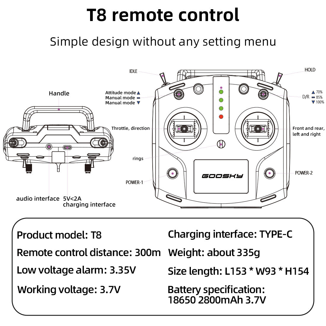 Remote control: 2.4G T8 remote control;