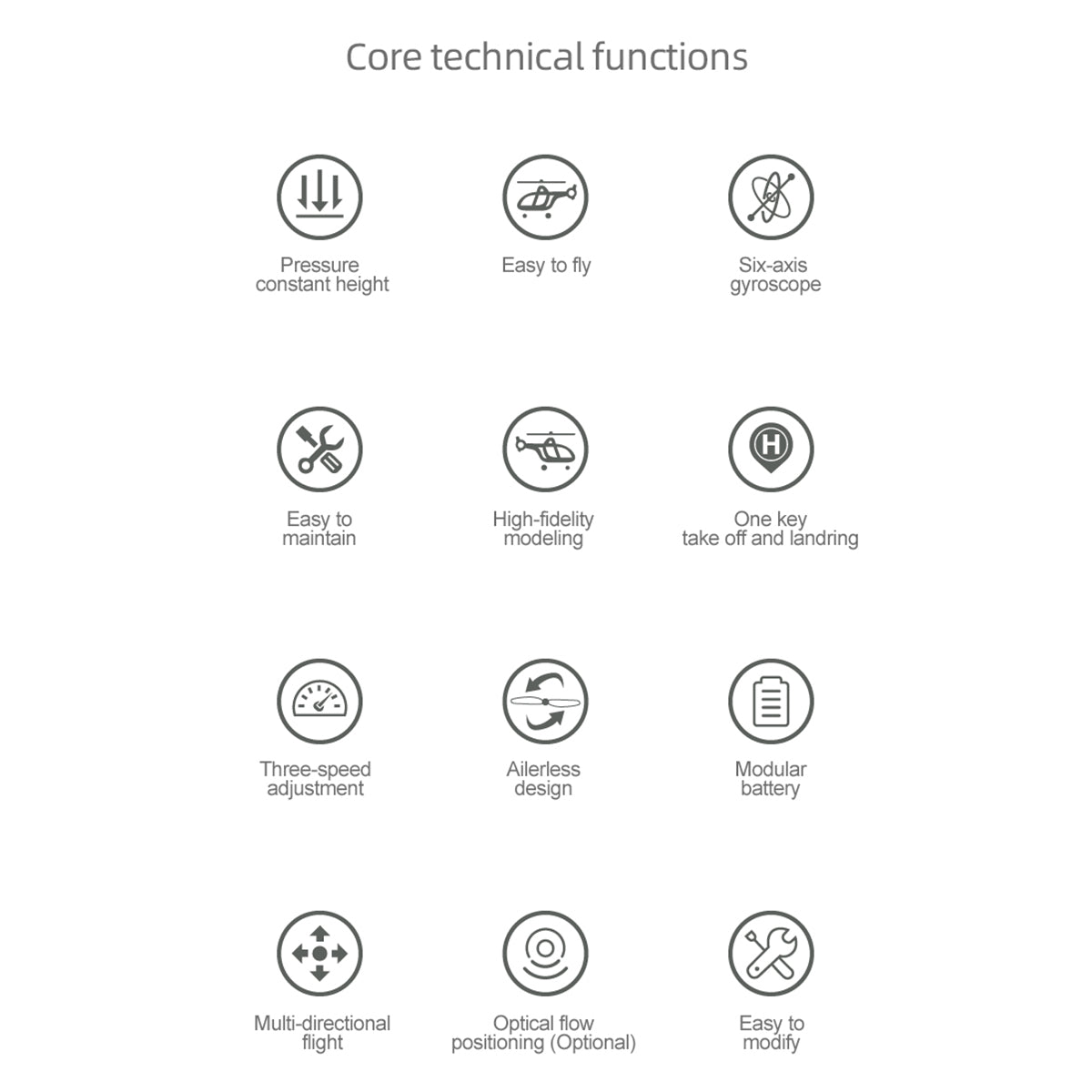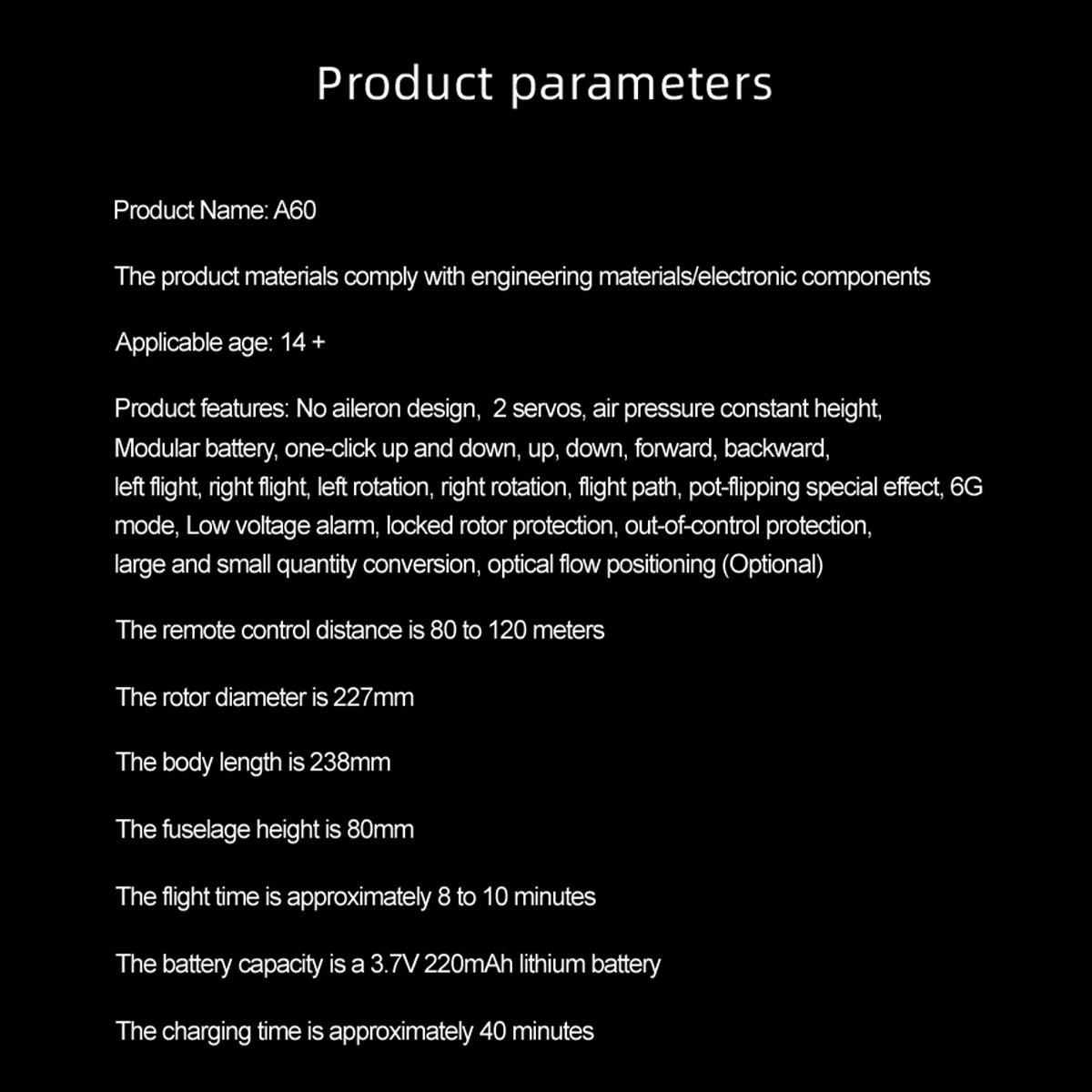 7. Low voltage alarm, stall protection, loss of control protection, large/small control input conversion, one-button takeoff, and one-button landing functions;