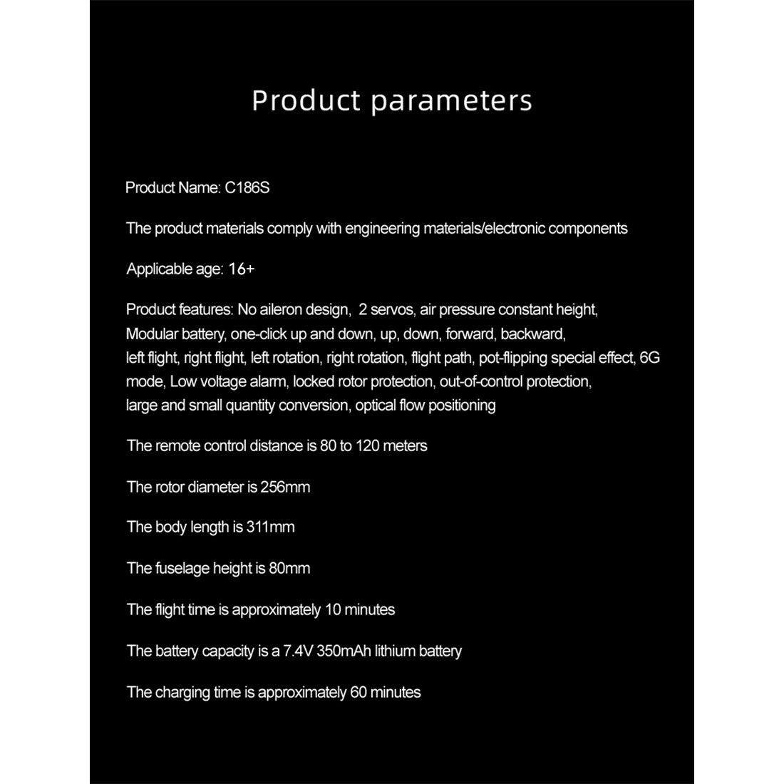 8. Features low-voltage warning, stall protection, loss-of-control protection, dual-rate switching, one-touch takeoff, and one-touch landing;