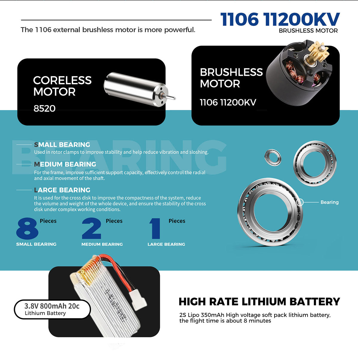 9.Use 1106 outward rotating brushless motor with stronger power, standard 3.8V 800mAh 20c high-voltage battery with large multiplier, flight time 8-10 minutes.