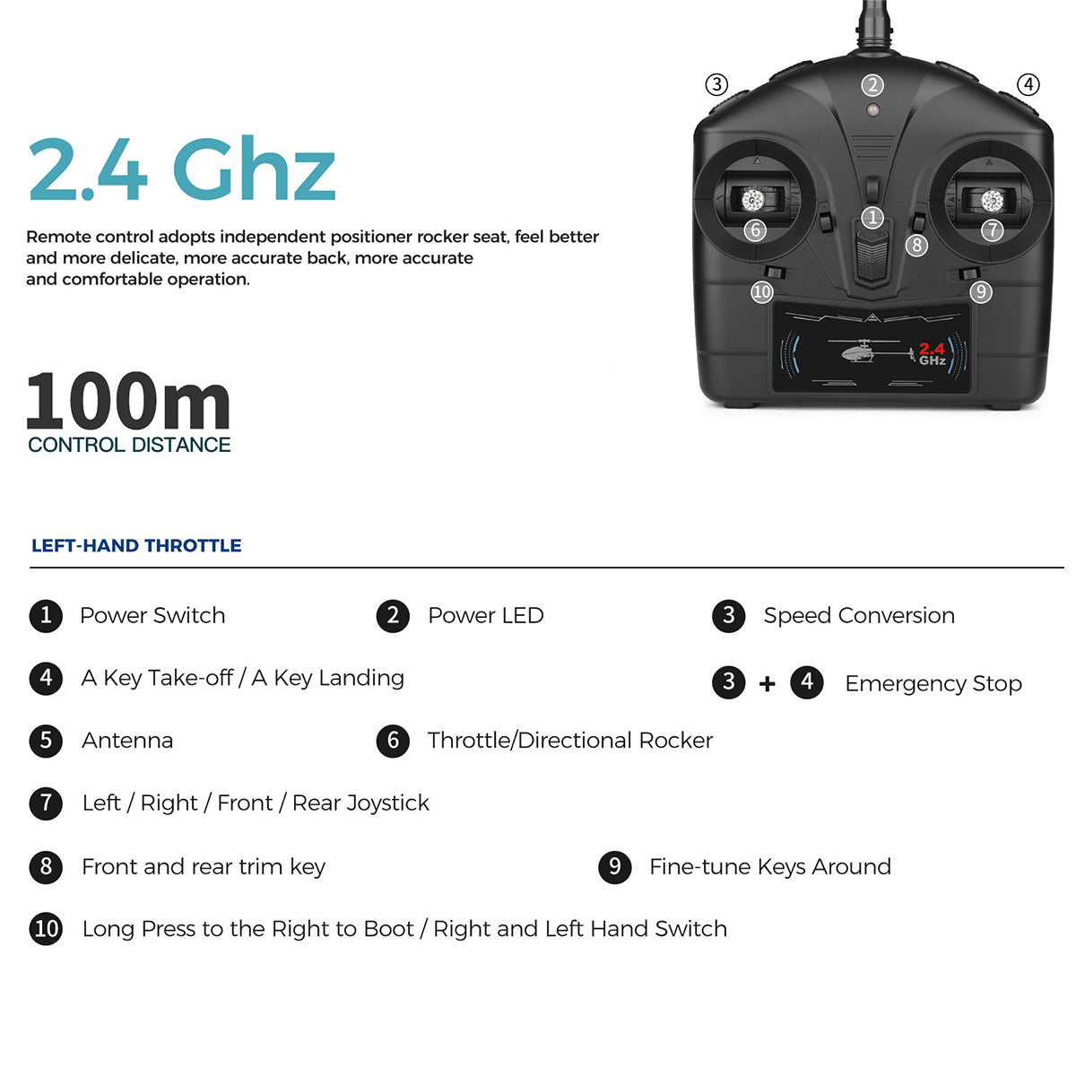 8. Simple 4-channel design, using 6-axis gyroscope, with air pressure altitude function flight more stable; remote control one key takeoff, one key landing, up and down, forward and backward, left and right steering, left and right side flight and other functions; so that the product is more easy to manipulate, more suitable for newcomers to operate.