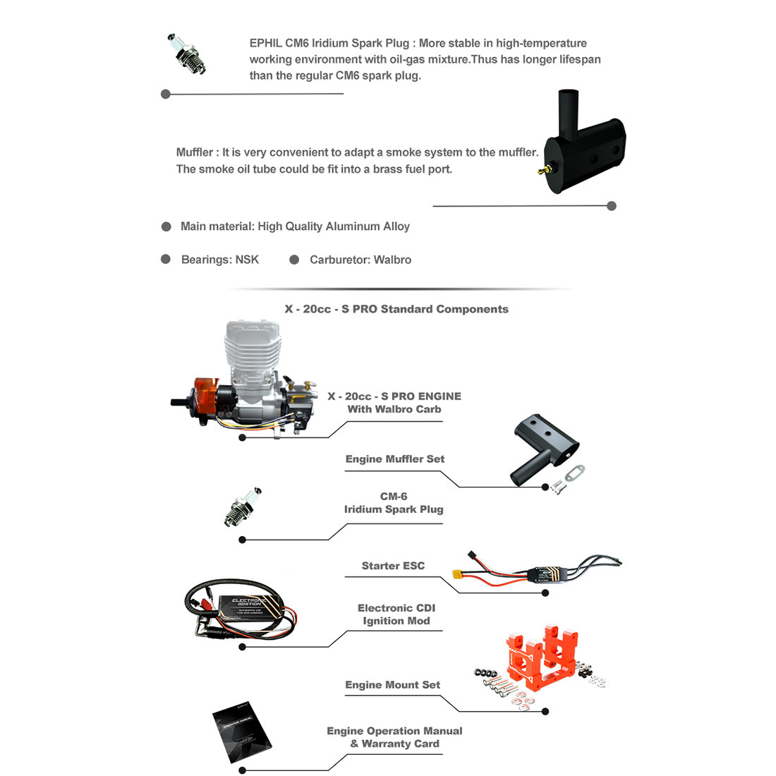 Packing list: engine * 1, exhaust pipe * 1, CM6 iridium spark plug * 1, CDI igniter * 1, engine bracket * 1, propeller shaft adapter * 1, gear-driven propeller shaft * 1, electric starter * 1, ESC electric regulator * 1, user manual and warranty card * 1
