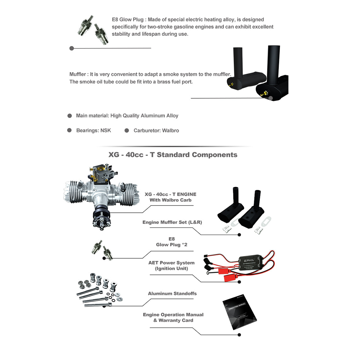 EPHIL XG-40cc-T Glow Plug Two-Stroke Twin-Cylinders Horizontally Opposed Gasoline Engine Model for Fixed-Wing Aircraft Models is backordered and will ship as soon as it is back in stock.