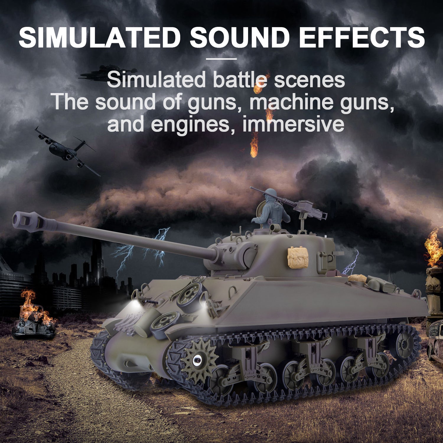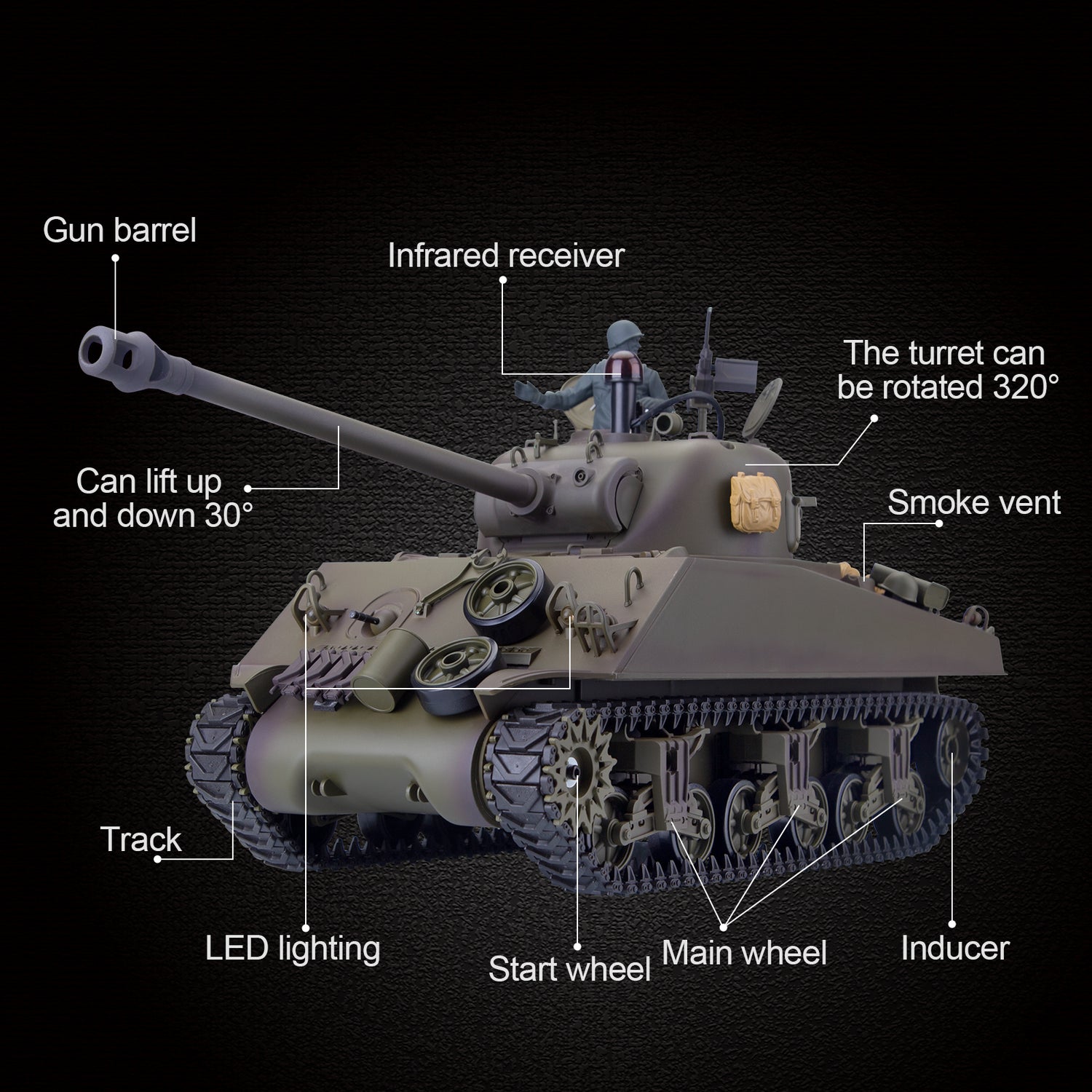 1/16 2.4G RC US M4A3 Sherman Medium Tank Vehicle Model Steel Gear Box Retractable Long Barrel Smoking Light Sound Launch BB Ammunition Infrared Ray