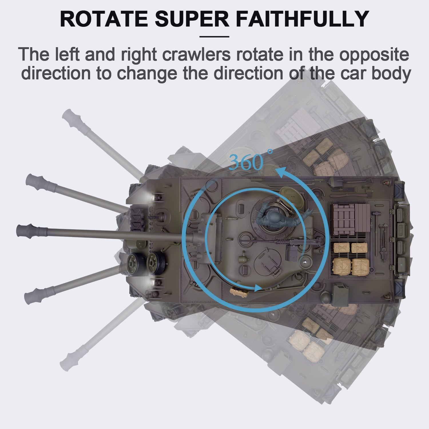 The 1:16 original scale restores the American M4A3 medium tank from World War II, with exquisite simulated decorative parts and commander, and an extra-long retractable gun barrel. It will stand out among many tank models.