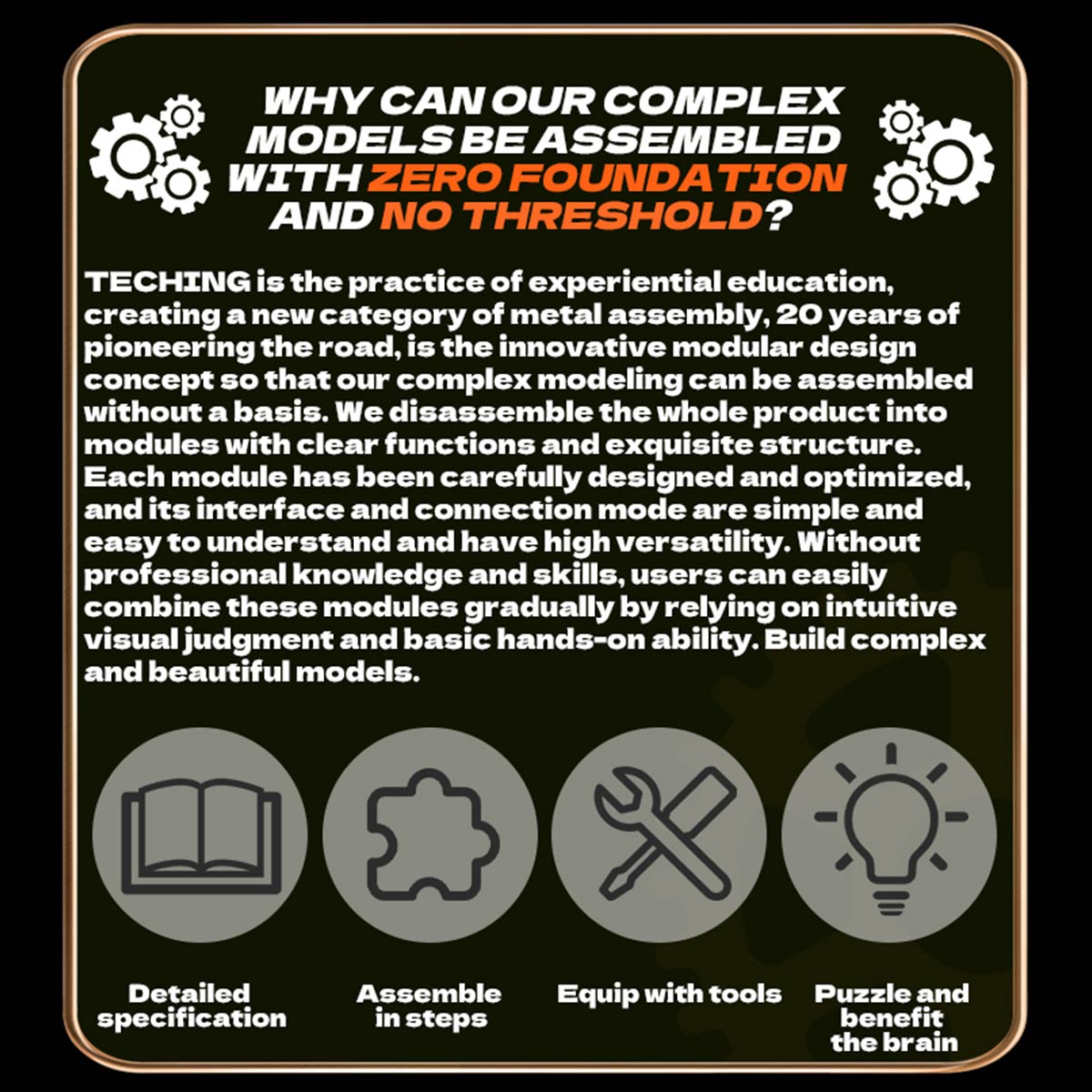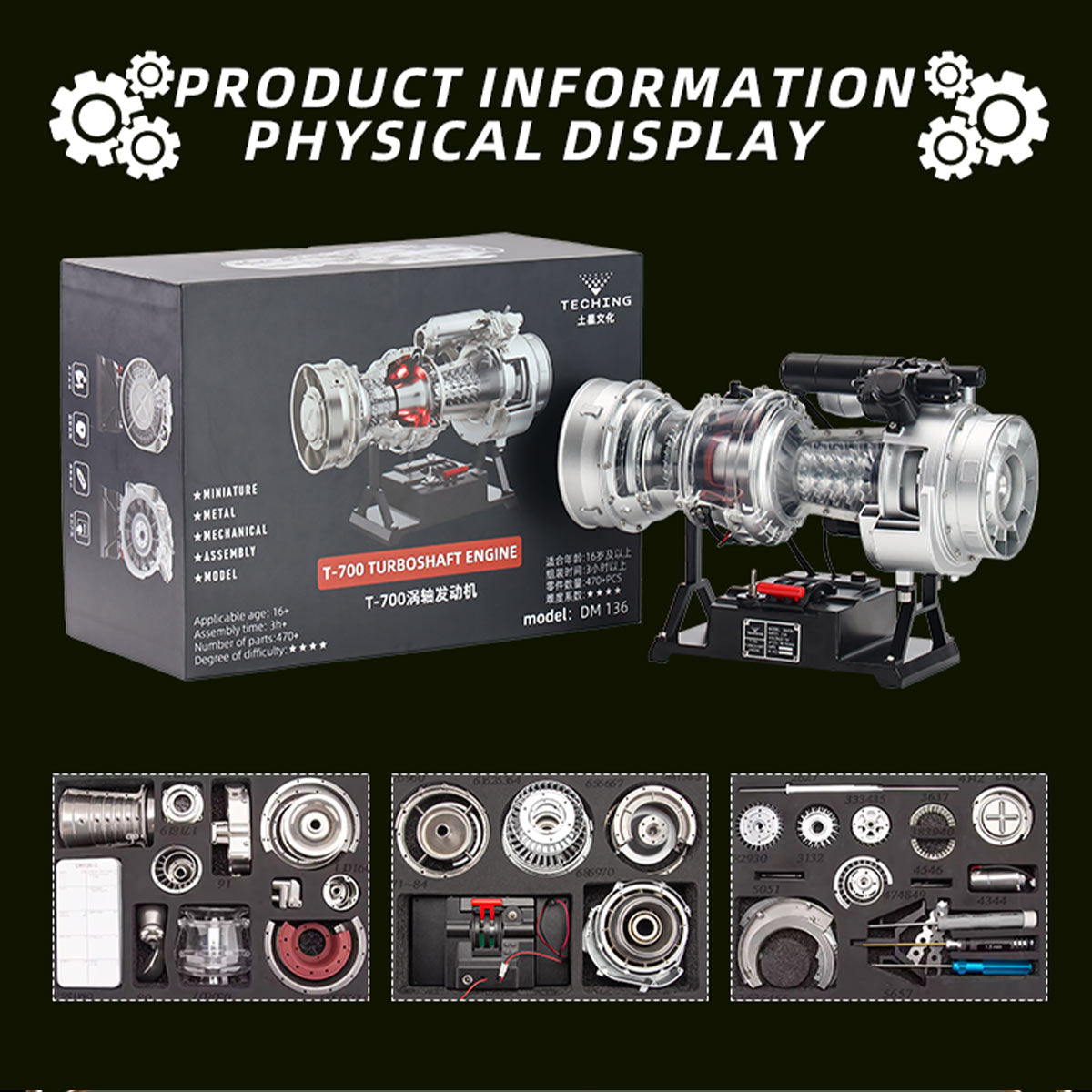 Welcome to the world of aviation modeling crafted for you by TECHING×SKYMECHMAN! Since the release of the DM119 turbofan engine and DM135 turbojet engine in the past two years, which have been well received by modelers, in 2025, we are now releasing the collectible T700 turboshaft engine model kit (Model: DM136). Continuing our pursuit of the ultimate in model aviation, this kit is a perfect 1/4 scale replica of a real helicopter turboshaft engine for aviation technology enthusiasts and modeling enthusiasts. It is made of aluminum alloy and stainless steel, with up to 470+ pcs of parts, blending industrial aesthetics and hardcore mechanical design, equipped with motor drive system, Li-ion battery and USB charging cable, which can simulate the dynamic operation of the turboshaft engine, and truly restore the shocking charm of the power core, as if it is a real engine scaled down and presented in front of your eyes. Support 4 hours + immersive hands-on assembly experience, four-star difficulty challenges hands-on ability and engineering thinking, both STEM education artifacts, but also display-level desktop art. With the engine kit, tools and instruction manual included in the box, this is a one-stop modeling experience for you to enjoy the whole process from assembly to driving!