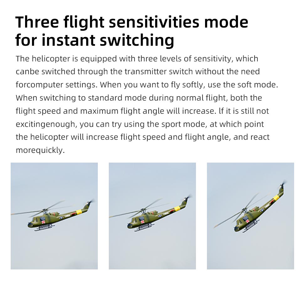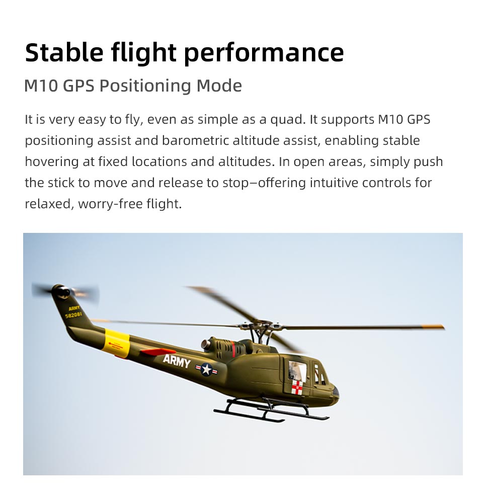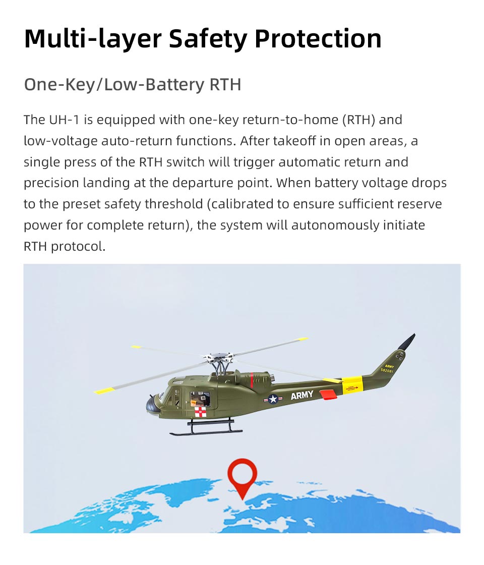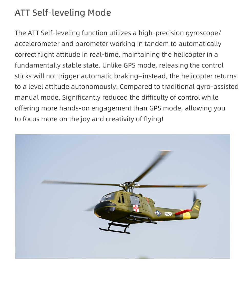 1. The 470-level UH1 Huey V3 is a six-channel remote control model that simulates a real helicopter. It is equipped with a 16V high-power motor and is easy to maintain. It is equipped with an H1 flight control with omnidirectional positioning technology and a Beidou positioning system, which can achieve forward flight/inverted flight and fixed-point hovering. The addition of intelligent return allows you to automatically return to the take-off point when the battery is out of power/the aircraft is invisible. After GPS positioning, use the 3D stunt mode and switch to GPS mode at any time to save the aircraft.