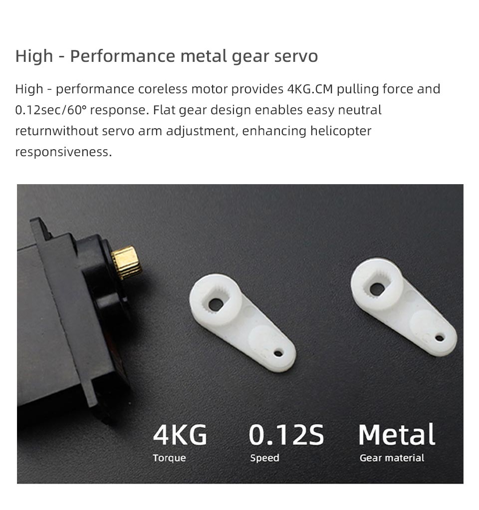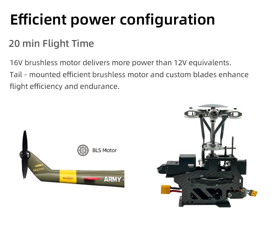 4. It uses a 2816-level large brushless motor driven by a higher voltage of 16v, which has greater horsepower and higher efficiency. With 32-bit dual-processing 16v 60A all-metal helicopter dedicated ESC, the helicopter can maintain super-fast response ability in intense 3D flight, and the excellent speed control effect allows the entire "flight process" to maintain consistent power output without turning around.