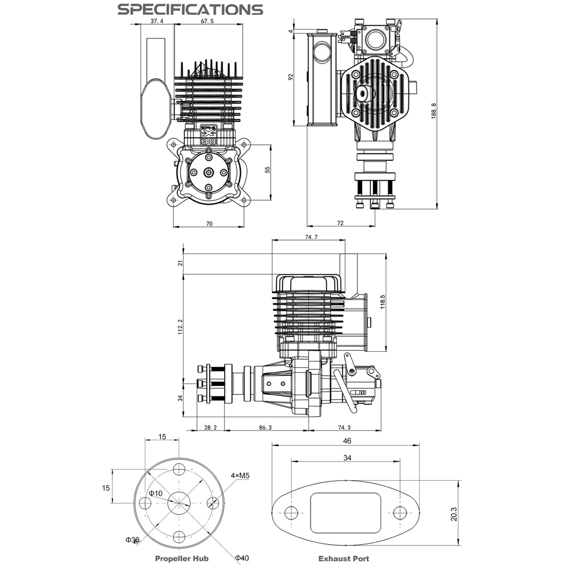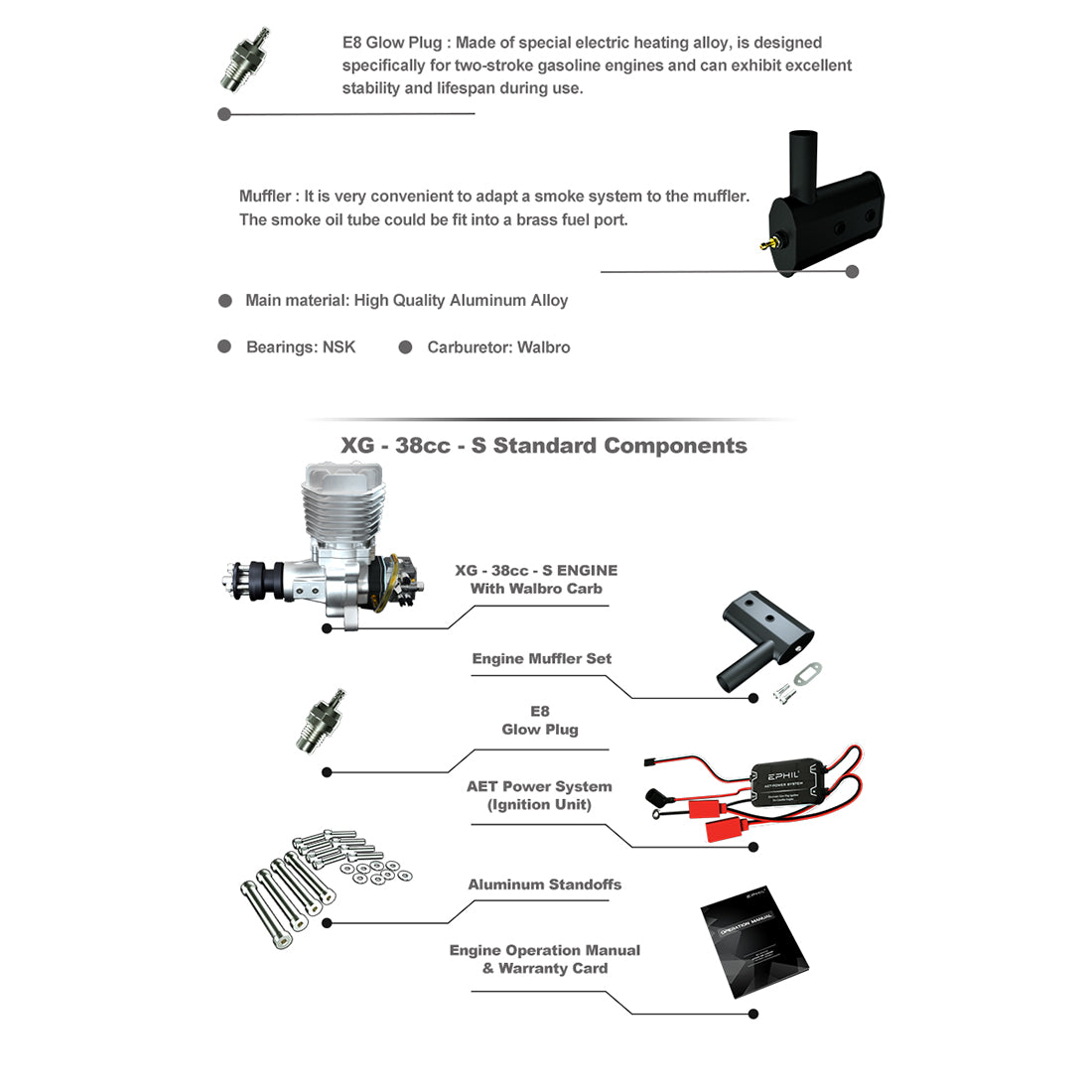 EPHIL XG-38cc-S Glühkerze Zweitakt-Einzylinder-Benzinmotormodell mit seitlichem Auspuff für Starrflügelflugzeugmodelle