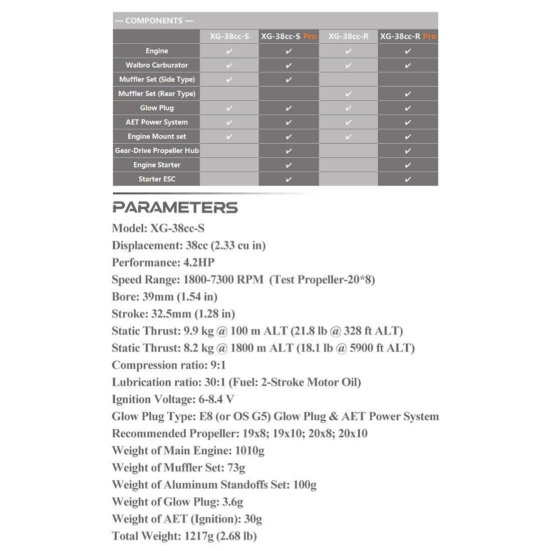 Anwendbare Propellerspezifikationen - Empfohlener Propeller: 19x8; 19x10; 20x8; 20x10