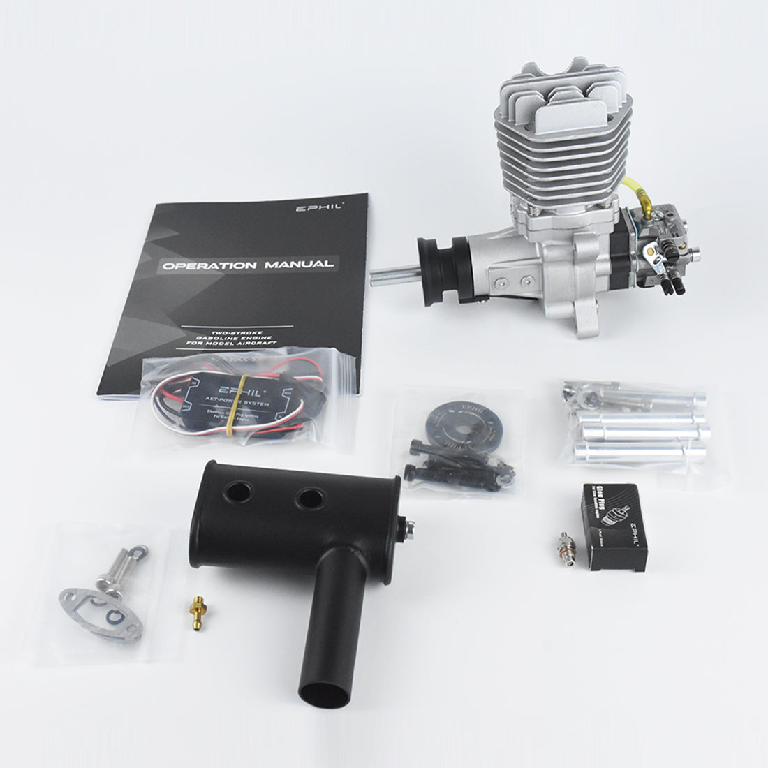 Packliste: Motor*1, Vergaser*1, Auspuffrohr*1, Glühkerze*1, elektronischer Zünder*1, Motorhalterung*1, Benutzerhandbuch und Garantiekarte*1