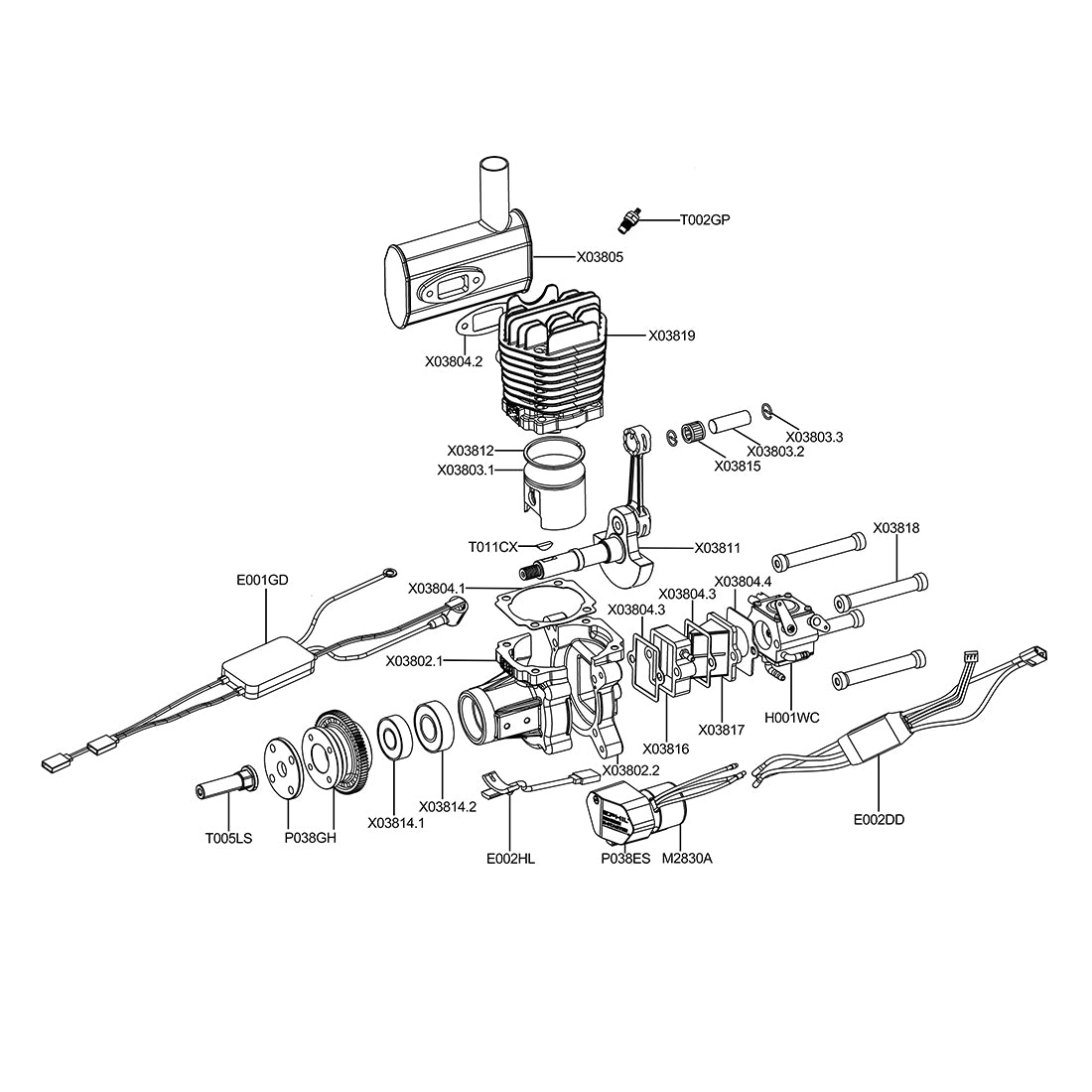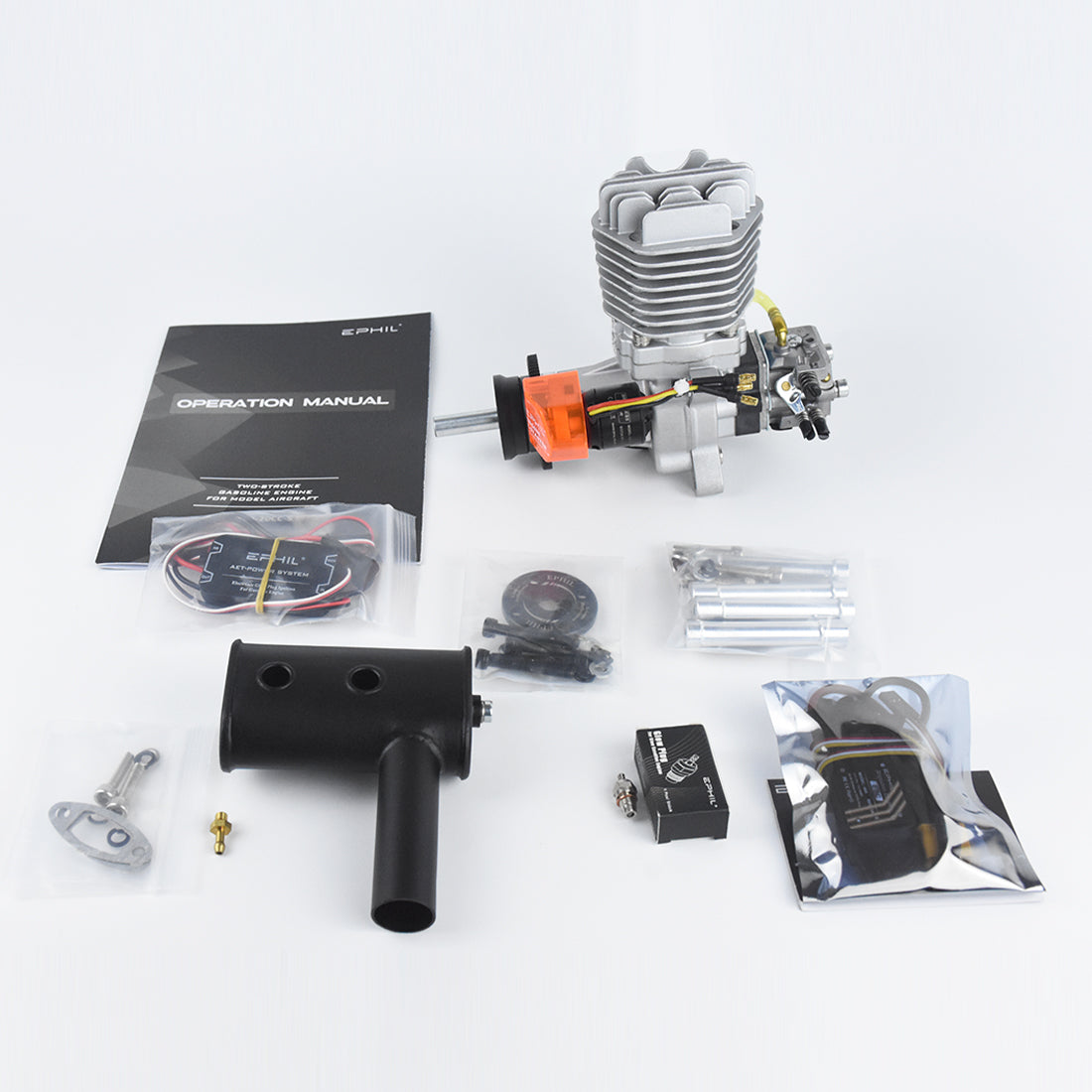 Packliste: Motor*1, Vergaser*1, Auspuffrohr*1, Glühkerze*1, elektronischer Zünder*1, Motorhalterung*1, Propellerwellenadapter*1, zahnradgetriebene Propellerwelle*1, Elektrostarter*1, ESC*1, Benutzerhandbuch und Garantiekarte*1