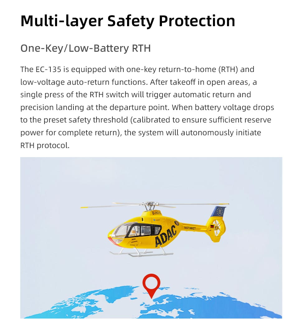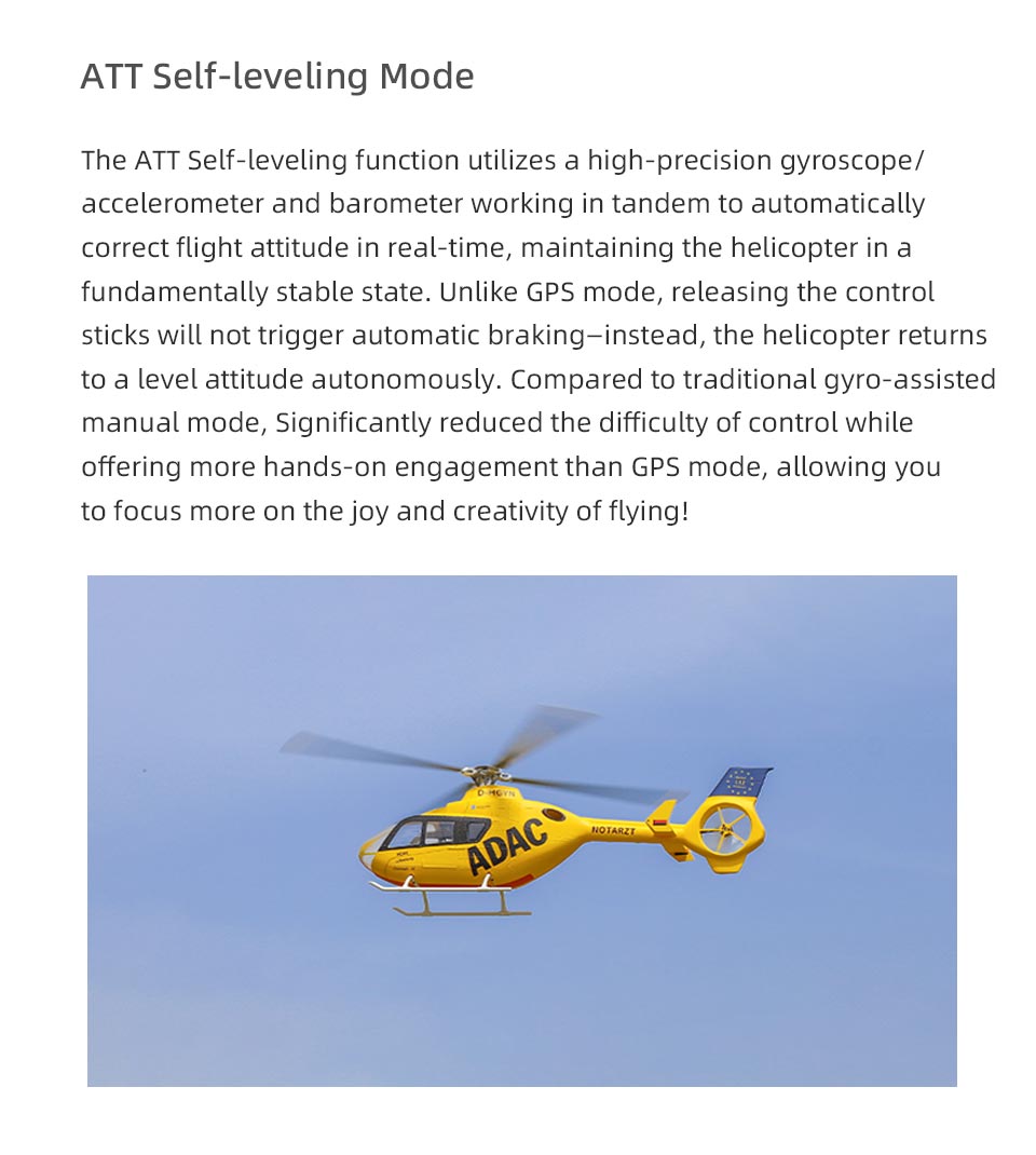 Der EC135 mit 1.470 Level simuliert ein echtes RC-Modell mit sechs Kanälen und ist mit einem 16-V-Hochleistungsmotor ausgestattet. Die Wartung ist einfach. Dank der H1-Flugsteuerung mit omnidirektionaler Positionierungstechnologie und dem Beidou-Positionierungssystem können Sie einen positiven Flug/Rückenflug mit festem Schwebepunkt durchführen. Die intelligente Rückkehrfunktion ermöglicht es Ihnen, das Flugzeug automatisch zum Startpunkt zurückzubringen, wenn die Batterie leer ist oder Sie es nicht sehen können. Bei der GPS-Positionierung wird der 3D-Kunstflugmodus verwendet. Nach der GPS-Positionierung können Sie im 3D-Kunstflugmodus jederzeit in den GPS-Modus wechseln, um das Flugzeug zu retten.