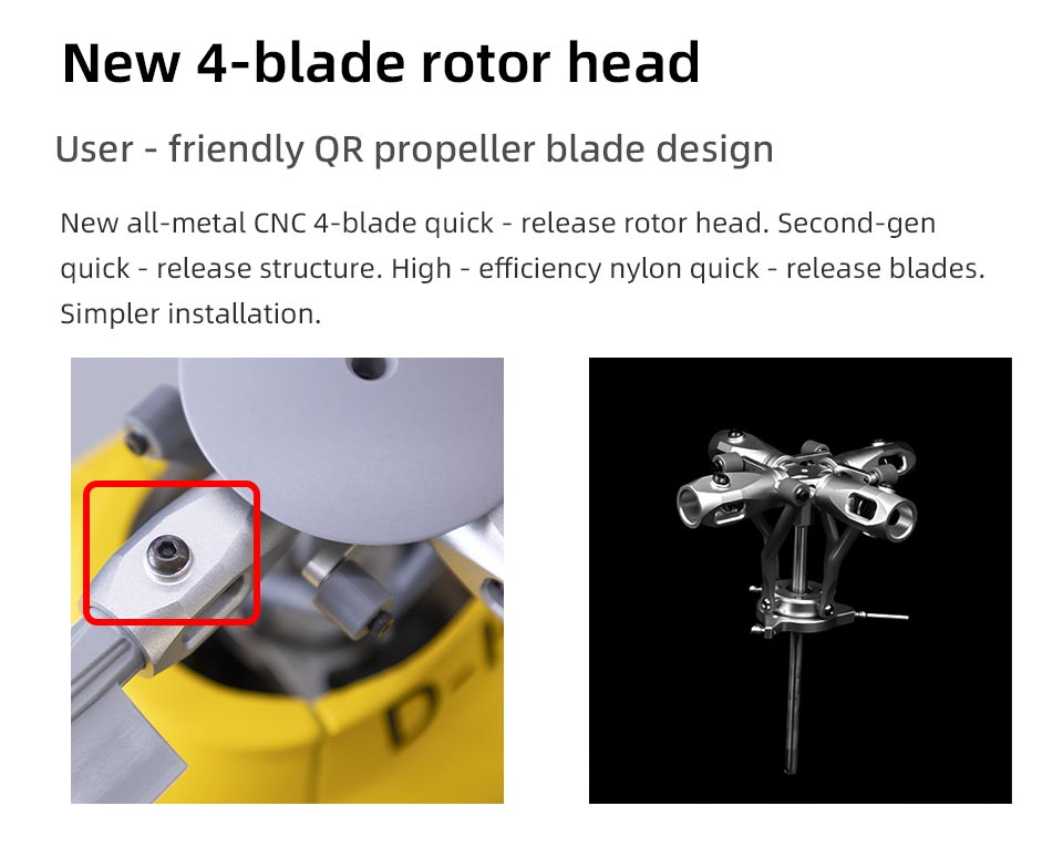 2.EC135 verwendet den neuen Vierblatt-Rotorkopf mit benutzerfreundlichem Schnellverschluss-Paddeldesign, einen CNC-Vierblatt-Schnellverschluss-Rotorkopf aus Metall und eine innovativ gestaltete Schnellverschlussstruktur der zweiten Generation mit hocheffizienten Schnellverschluss-Nylonblättern für eine einfachere Installation.