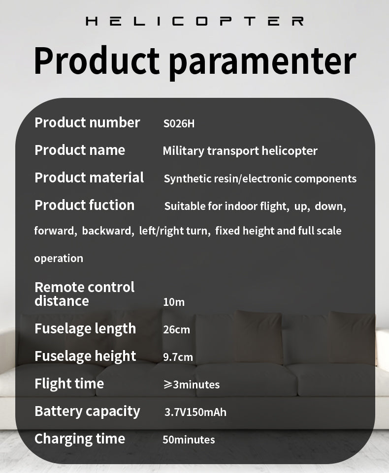 .Basierend auf einem Transporthubschrauber mit Doppelrotor, 3-Kanal-Fernsteuerung und Gyro. Ausgestattet mit Gyrokalibrierung, Überziehschutz, Schutz bei schwacher Batterie und Übertemperaturschutz für ein stabiles und angenehmes Flugerlebnis.