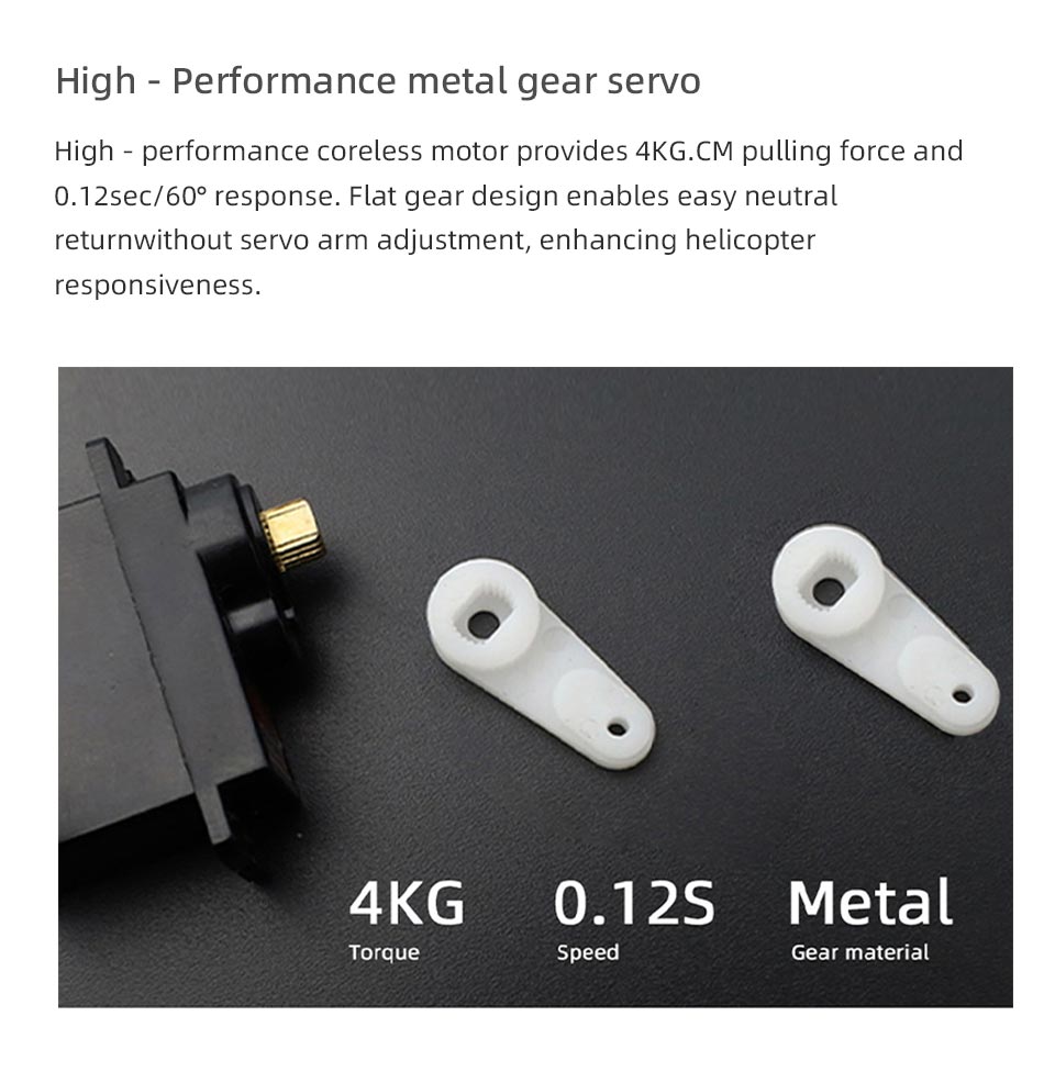 4.Adopting 16v higher voltage driven 3508 level brushless motor, phase has more horsepower, higher efficiency. With 32-bit dual-processing 16v 60A all-metal helicopter-specific ESC, the helicopter maintains ultra-fast responsiveness in the intense 3D flight, and the excellent fixed-speed effect allows the entire flight process to maintain a consistent power output, without spinning.