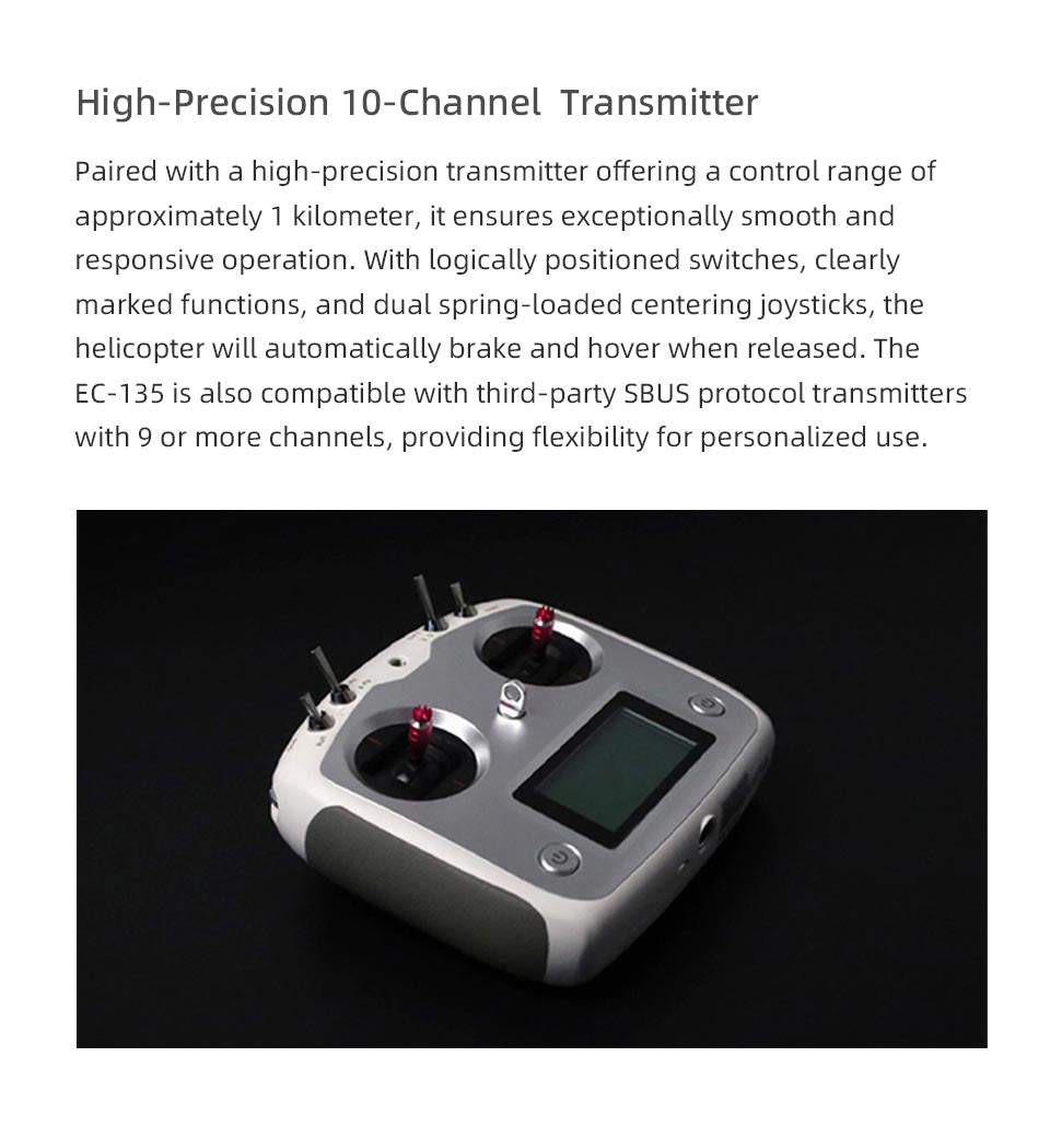 2.EC135 adopts the new four-bladed rotor head with easy-to-use quick-release paddle design, all-metal CNC four-bladed quick-release rotor head, innovatively designed second-generation quick-release structure with high-efficiency quick-release nylon prize blades to bring a simpler installation experience.