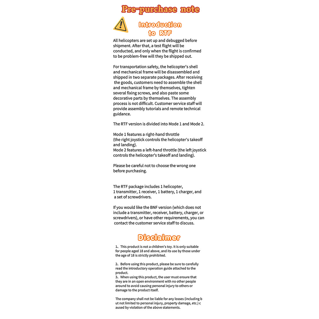 Notes: Radio-controlled model helicopters are high-risk products. Always fly away from crowds. Improper assembly, unfamiliar operation, damaged components, faulty electronic controls, or lack of familiarity with controls may lead to unpredictable accidents such as loss of control or injury. Pilots must prioritize flight safety and understand they bear full responsibility for any accidents caused by negligence. Before each flight, meticulously inspect the main rotor hub cross-axis screw, tail rotor hub screw, and all ball joints and screws throughout the airframe. Ensure all fasteners are securely glued and tightened before taking flight.