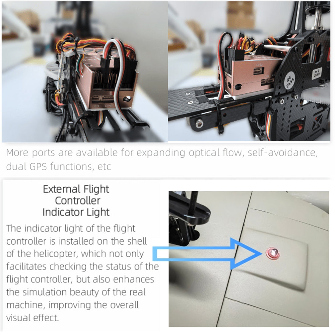 1.High-precision rotor head: CNC processed high-precision DFC rotor head, its metal texture brings a great enhancement in the sense of view. The high precision is also effective in reducing vibration and wear during flight, and the DFC rotor head has a low center of gravity and compact structure, which can provide better power performance.
