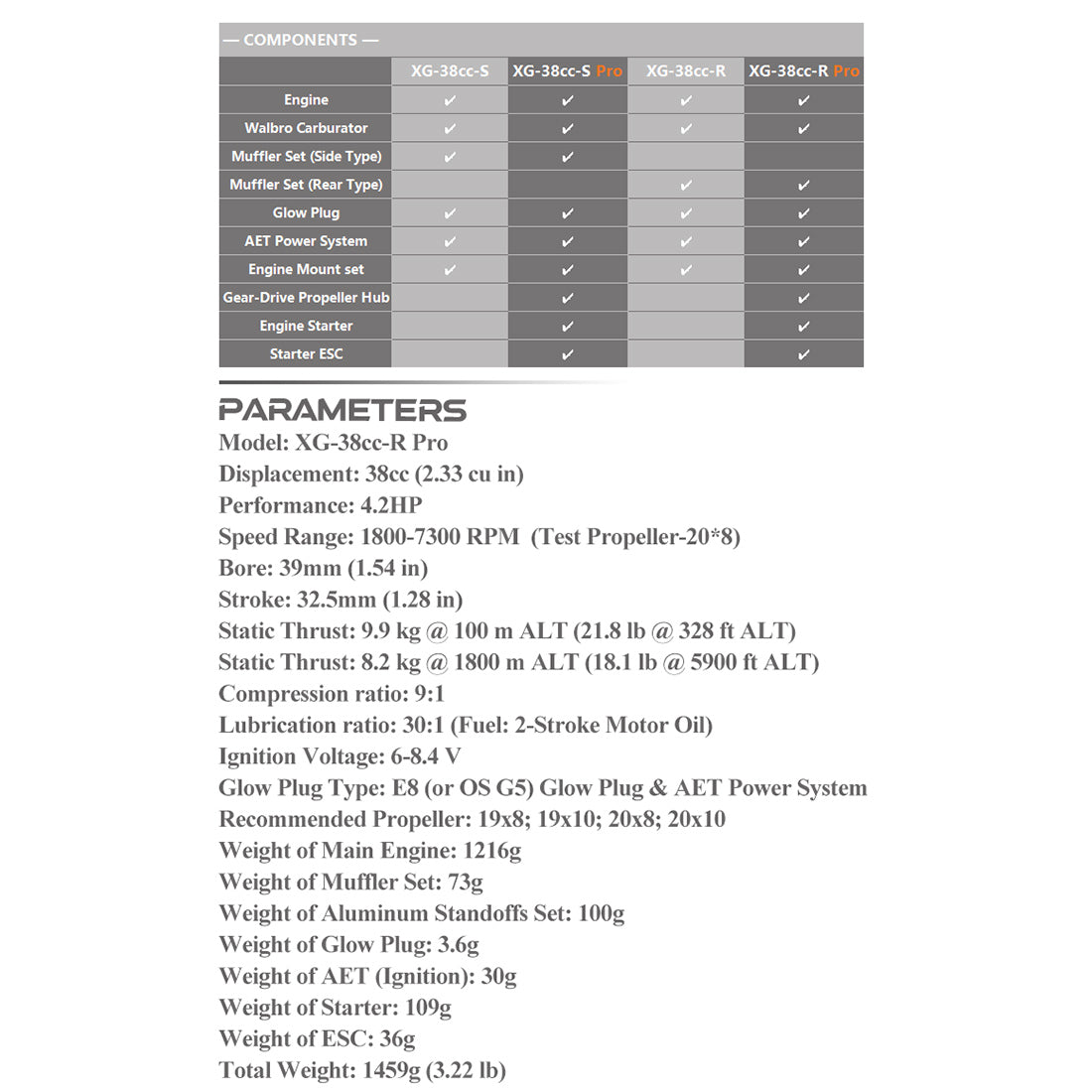 포장 목록: 엔진*1, 기화기*1, 배기 파이프*1, 글로우 플러그*1, 전자 점화 장치*1, 엔진 브라켓*1, 프로펠러 샤프트 어댑터*1, 기어 구동 프로펠러 샤프트*1, 전기 스타터*1, ESC*1, 사용 설명서 및 보증서*1