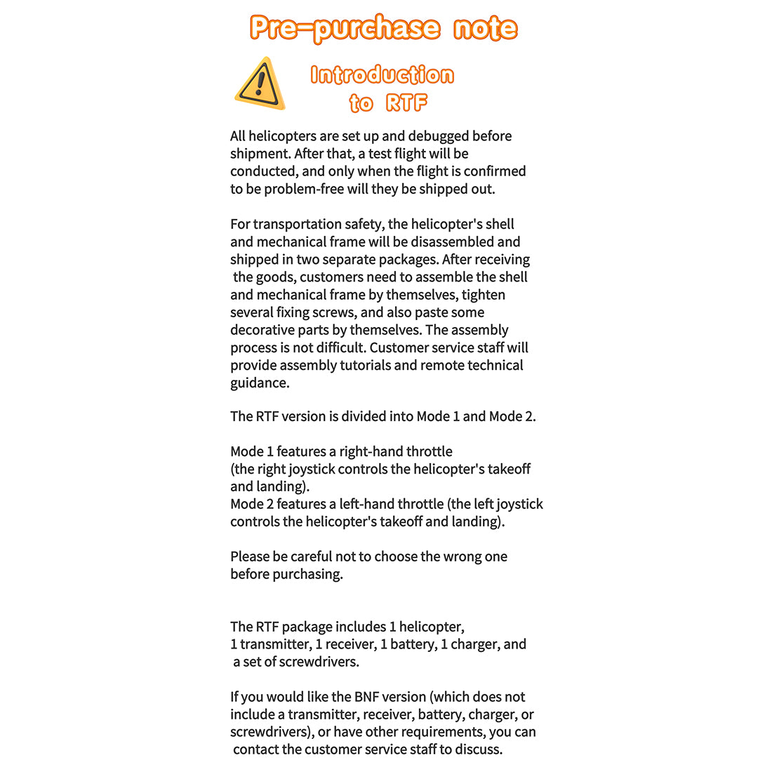 Notes: RC helicopters are high-risk products. Always fly away from crowds. Improper assembly, unfamiliar operation, damaged components, faulty electronic controls, or lack of familiarity with controls may lead to unpredictable accidents such as loss of control or injury. Pilots must prioritize flight safety and understand they bear full responsibility for any accidents caused by negligence. Before each flight, meticulously inspect the main rotor hub cross-axis screws, tail rotor hub screws, and all ball joints and screws throughout the airframe. Ensure all fasteners are securely glued and tightened before taking flight.