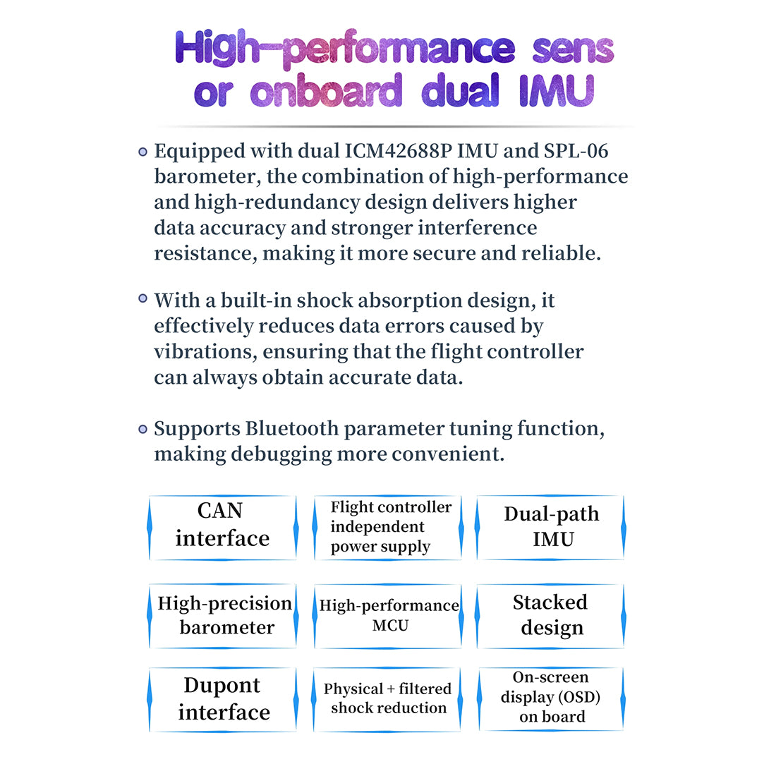 6. High-Performance Onboard Dual-Channel IMU: Equipped with a dual-channel ICM42688P IMU and an SPL-06 barometer, the combination of high performance and high redundancy delivers greater data accuracy and stronger anti-interference capabilities, ensuring greater safety and reliability. The built-in shock absorption design effectively reduces data errors caused by vibrations, ensuring the flight controller always acquires accurate data. Supports Bluetooth parameter tuning for more convenient debugging.