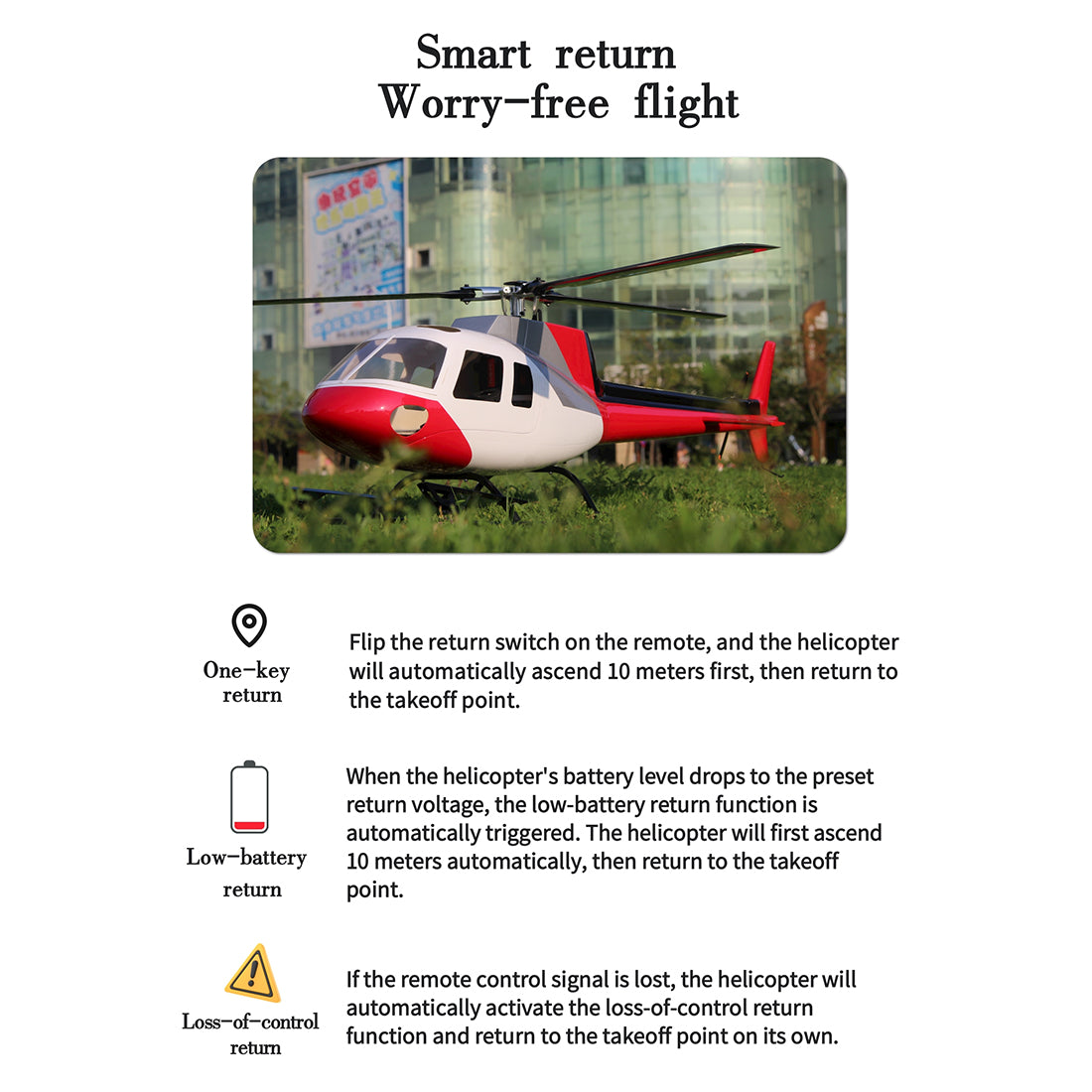 5. Hovering and self-stabilized flight—a boon for beginners: Leveraging the L7 flight controller’s high-precision calculations and GPS positioning, the helicopter can effortlessly achieve self-stabilized flight and hovering positioning in the air, delivering a “push-and-fly, release-and-stop” experience. Flight attitude can be adjusted without additional manual input. Not only can beginners easily control the helicopter and experience the thrill of flight, but experienced pilots can also bid farewell to cumbersome operations and fully enjoy flight maneuvers as graceful as those of a scale model.