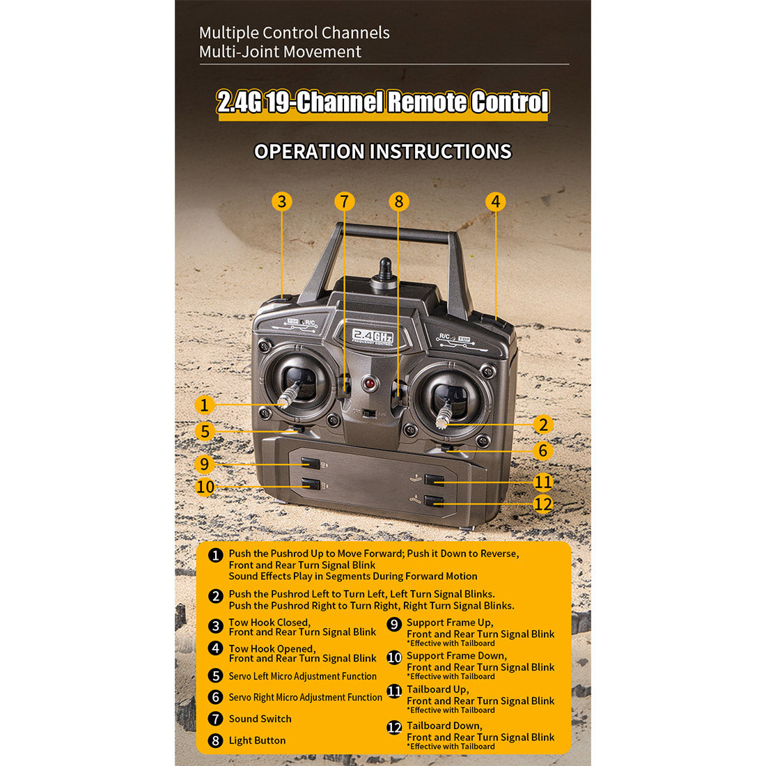 1. Flexible Control: Forward/Reverse/Left Turn/Right Turn/Hook Open/Hook Close/Servo Left Fine-Tune/Servo Right Fine-Tune/Sound On/Sound Off. Meets diverse scenario needs for a nimble and responsive control experience.