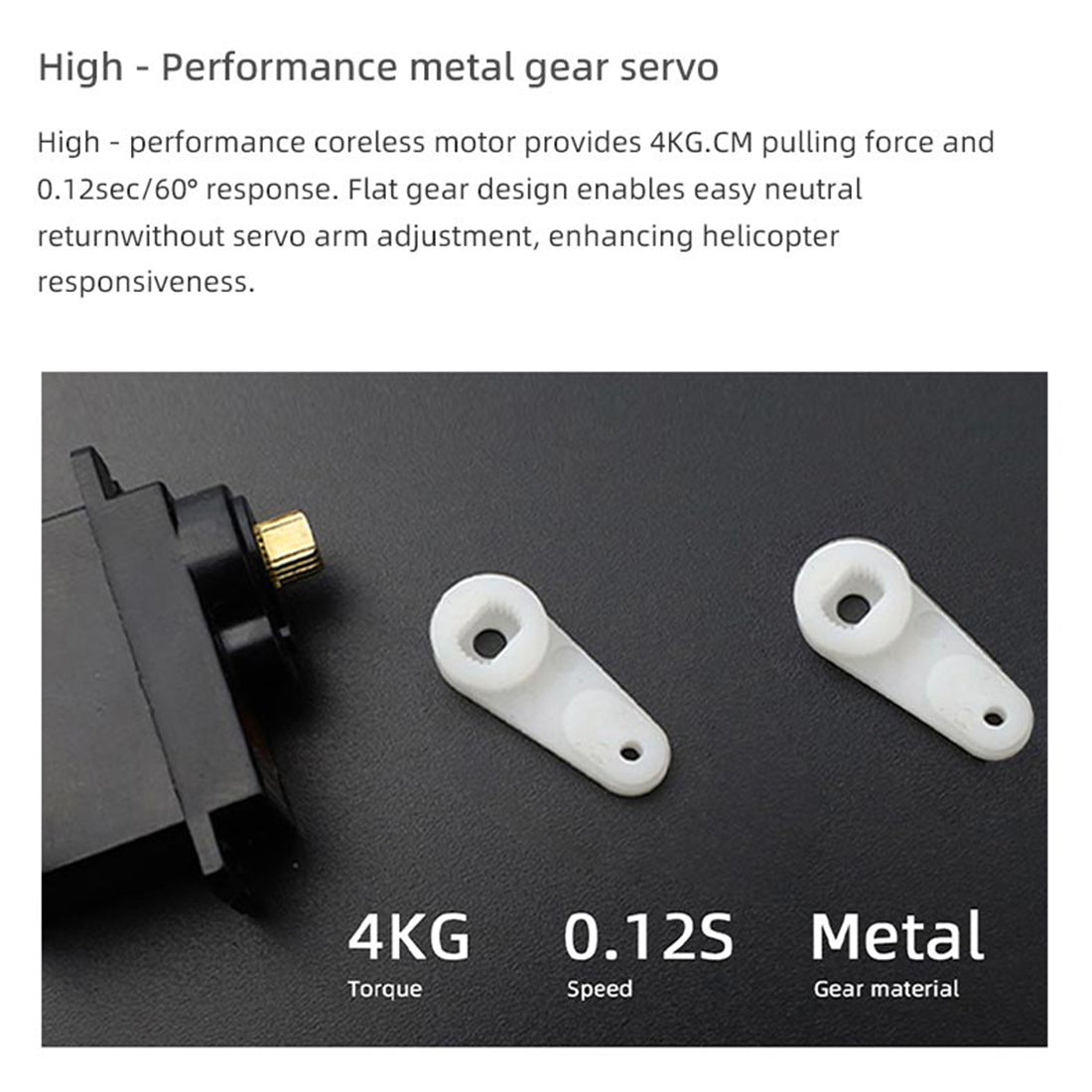 4, using 16v higher voltage driven 3508 level brushless motor, phase has more horsepower, higher efficiency. With 32-bit dual-processing 16v 60A all-metal helicopter-specific ESC, the helicopter maintains ultra-fast responsiveness in the intense 3D flight, and the excellent fixed-speed effect allows the entire flight process to maintain a consistent power output, without spinning.