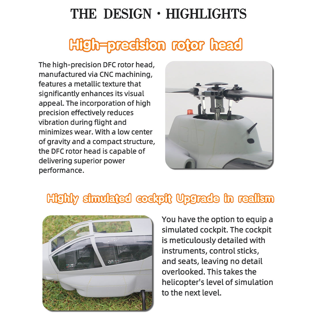 1. High-precision rotor head: CNC processed high-precision DFC rotor head, its metal texture brings a great improvement in the sense of view. The high precision is also effective in reducing vibration and wear during flight, and the low center of gravity and compact structure of the DFC rotor head can provide better power performance.